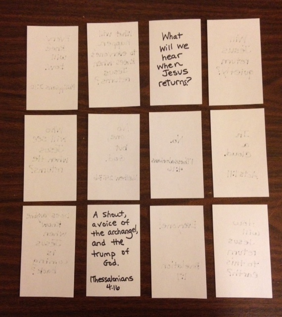 BOOK TO REMEMBER: 1 Thessalonians. Write "1 Thessalonians" on small pieces of paper and hand out to the students at the end of Bible class, so they words may be taken home, memorized, and recited at the next Bible class. By memorizing the books of the Bible, the children will be able to find any book of the Bible without dependence on lists, bookmarks, or parents.